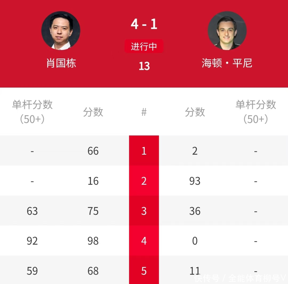 第四局,肖国栋又打出单杆92分,98-0零封平尼,比分来到3-1,并赢得两个赛点,敌手被逼入逼入绝境。第五局,莫得退路的平尼反击无力,肖国栋则是不竭发力,他又打出单杆59分,68-11锁定胜局,总比分4-1投诚敌手,强势开启本次比赛之旅。