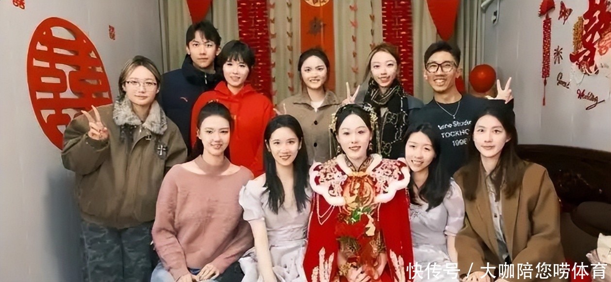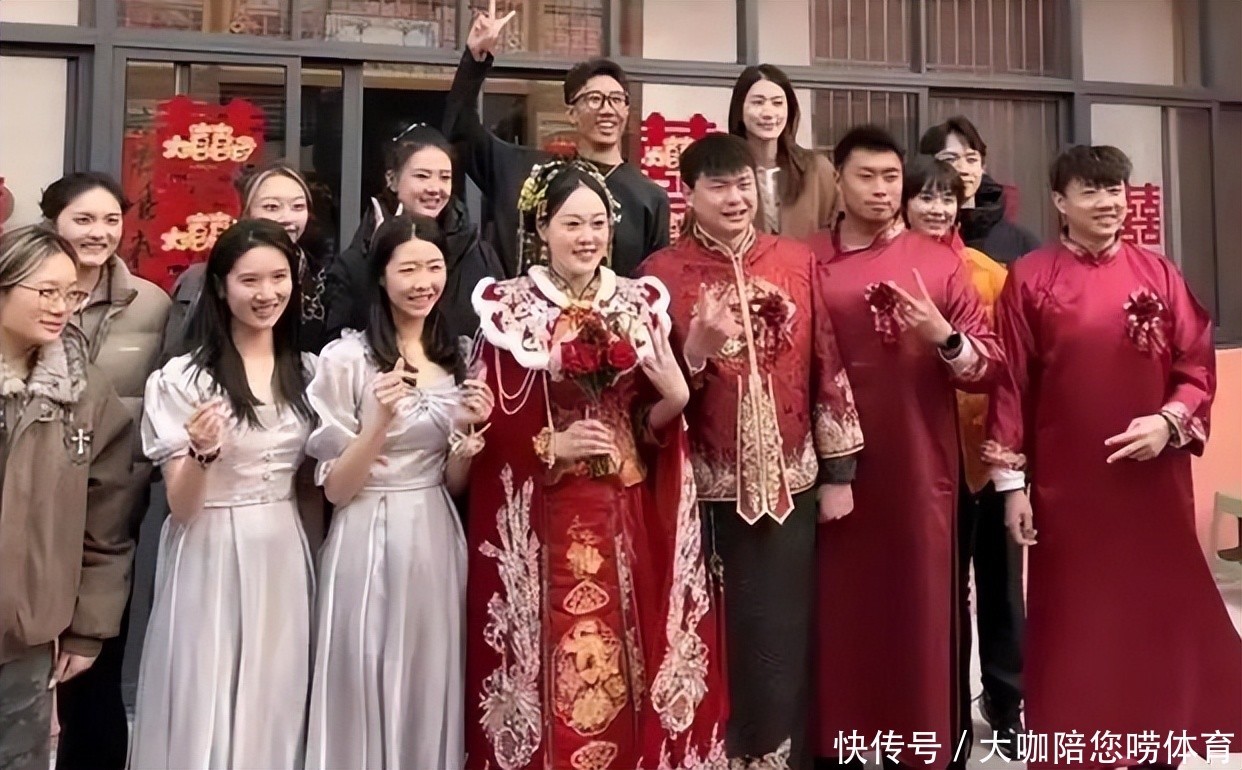 另外一张相片上,新郎新娘和伴郎伴娘以及亲一又团全部合影。两位伴娘穿戴白色的长裙,而两位伴郎则穿戴红色的长马褂。亲一又团在后头一瞥。看相片布景,应该是在婚房门口拍摄的!酬酢媒体上,球迷也纷纷留言送解手喜祝愿。