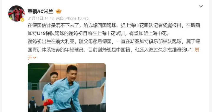 当欧洲五大联赛的冬窗转会硝烟渐散,一则来自中超的音书却不测引爆公论,到底是什么重磅音书?底本是德国青训体系培养的19岁中国小将谢筠初,被曝在上海申花试训,或毁灭留洋精采中超。有东说念主质疑“在德国混不下去才回来?”“别东说念主挤破头留洋,他却反向操作?”网友的质疑声中,藏着中国足球最自恃的命题:留洋镀金,确实是年青球员的独一出息吗?