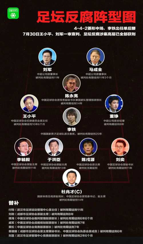 2024年底,中国足球系列衰弱案参加宣判季,杜兆才、刘奕、李铁、刘刚等前中国足协、方位足协要员以及足坛东说念主士被逐个宣判。