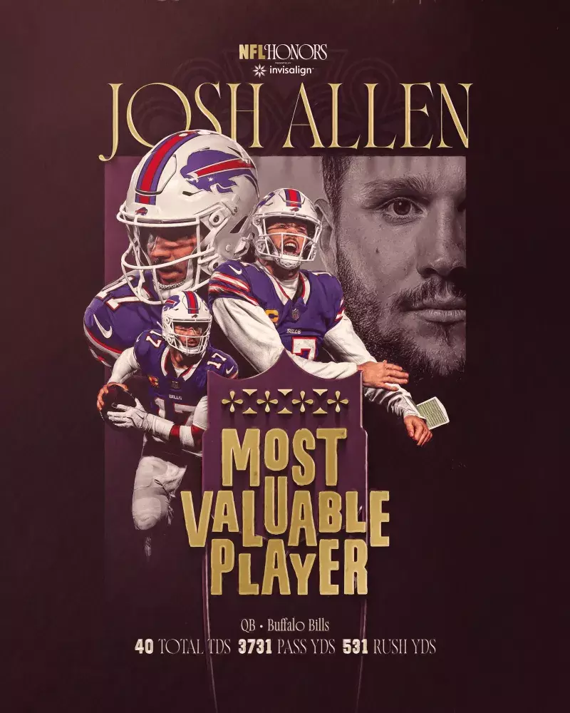 据NFL官方音信,布法罗比尔的四分卫约什-阿伦当选2024赛季老例赛MVP。
